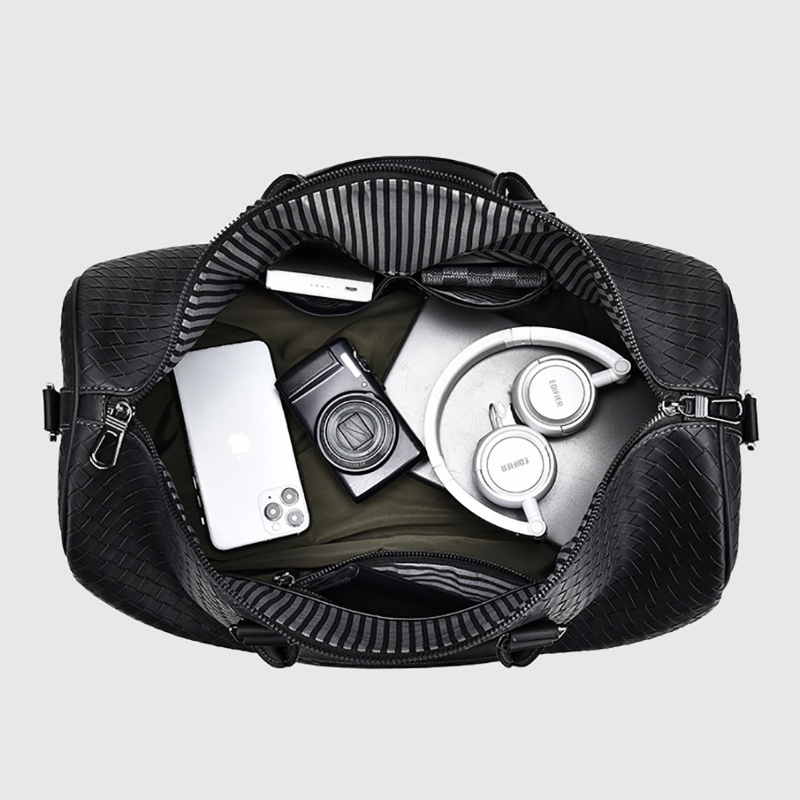 With a striped design that exudes elegance, this bag easily accommodates your essentials, from clothes to gadgets. Whether you’re heading for a weekend getaway or a business trip, its spacious interior and comfortable shoulder straps make carrying effortless.